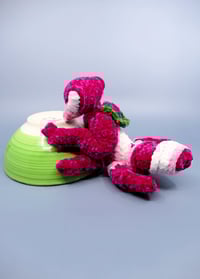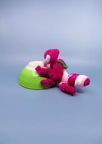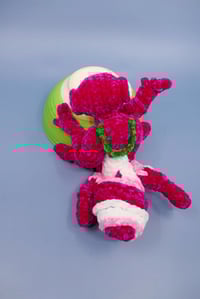 This beautiful little murder bug is a little hard to measure, but about 8 inches long. It's made from super soft velvet yarn. As you can probably tell from the pictures, it does need a little help standing up. I would also be happy to attach a yarn loop to the head should you prefer to hang it, just let me know.